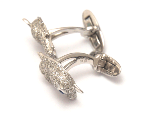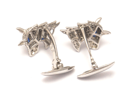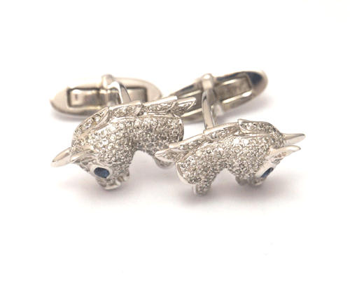 말 모양의 커푸스버튼입니다. 소재 : 18k 화이트골드 + 사파이어+ 다이아몬든 제품상태 좋습니다. 총중량 : 10.4g 말모양 사이