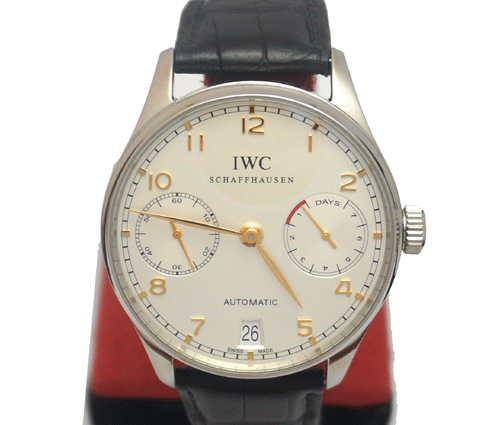 IWC 포르투기스 7Days 남성용 시계입니다. 사이즈 : 42mm 다이얼 : 흰색판에 금장인덱스 재질 : 스틸 무브먼트: 기계식자동(오토매틱) 밴드 : 악어가죽에 원터치 D버클 부속물 : 자체 보증서 원산지 : 스위스