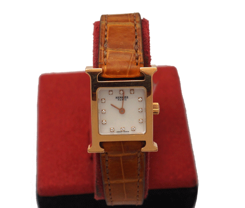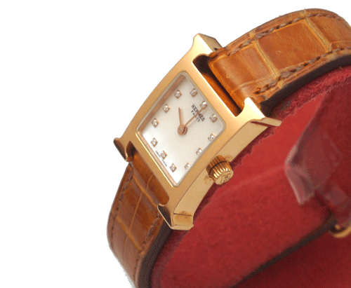 에르메스 H-아워 미니 시계 18k 로즈골드 , 자개판 , 포인트 다이아몬드 사이즈 : 20 *25mm 무브먼트 : 쿼츠(건전지) 부속품 : 박스, 보증서 원산지 : 스위스