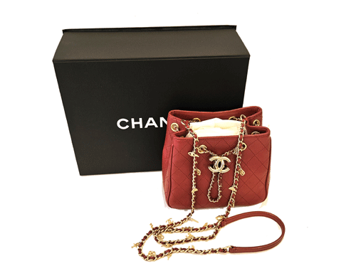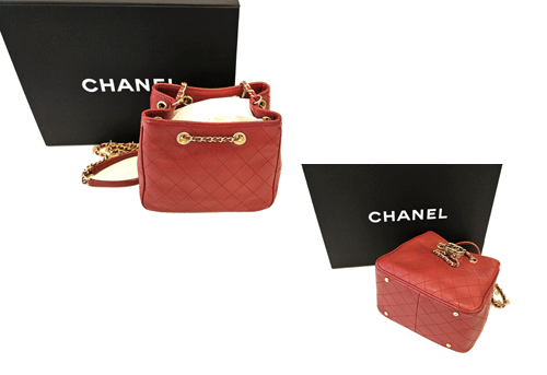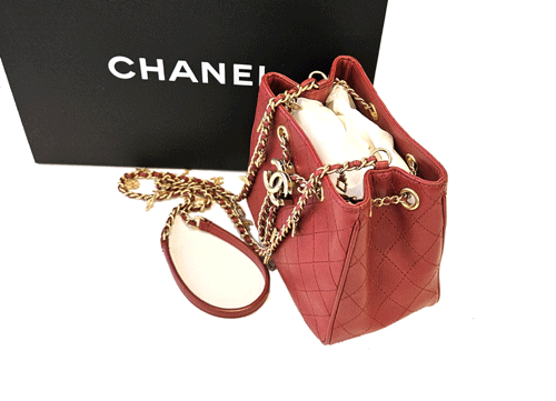 샤넬 레드 카프스킨 골드 메탈 드로스트링 버킷 미니 크로스백 입니다.