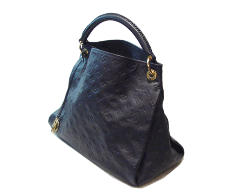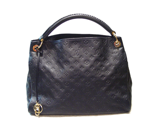 화려하게 엠보스 처리된 모노그램 앙프렝뜨 레더에 고급스러운 장식 핸들과